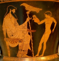 depicted as early as 460 BCE on an Attic bronze lid and satirized in 421 BCE by | depicted as early as 460 BCE on an Attic bronze lid and satirized in 421 BCE by | ||