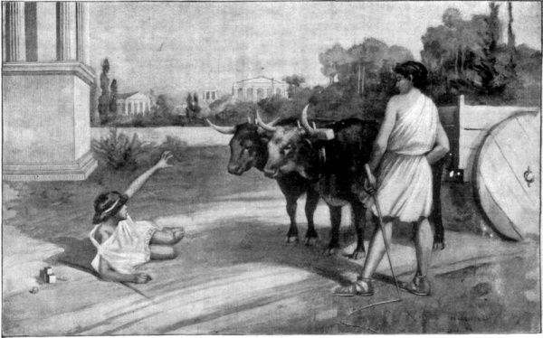Even as a young boy, he was very strong-willed. And perhaps as he had no father and mother to restrain his noble boyish inclinations, he was sometimes led by his own tenacity and courage into great danger. We are told that once, when he saw a wagon coming down the street where he and his playmates were playing knucklebones (jacks), he called to the man to stop. The man, who cared nothing for their game, drove on, and the other children quickly sprang aside so as not to be run over. Alcibiades, however, flung himself down across the road, in front of his playthings, and dared the driver to come on. The man was so amused by the little fellow’s pluck, that he actually turned around and drove through another street.[4] [5] [6]