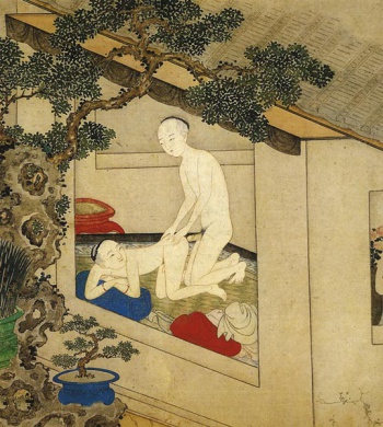 Li instructed Sun to hold his own buttocks and then bear down. He would enter Sun at that time. Meanwhile, Li lubricated his penis with his saliva, and with a strong push succeeded in entering Sun. Sun’s inside was still quite tight and dry. Li used another strong push, inserting the whole length of his penis. Li then forcefully pushed up and down, in and out. Gradually, Sun’s inside began to feel smooth and slippery. Li could now enter and withdraw easily. Sun began to feel as if liquid were flooding his inside, and had a strong sensual feeling. He began to move his buttocks up and down until he could hardly breathe and indulged himself in this pleasure.