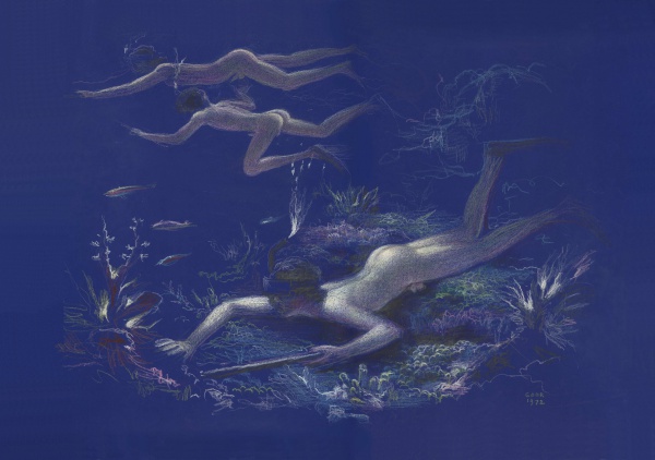 {{Image relative|GOOR Gaston 1972 Trois garçons nus à la pêche sous-marine 2752x1937.jpg|gauche|65%|600px|aligne-texte=gauche|''Trois garçons nus à la pêche sous-marine'', 1972 <br>Pastel sur papier bleu marine, 33 × 47 cm <br>Coll. particulière}}{{Image relative|GOOR Gaston 1974 L'Amour couronné de roses 1978x2943.jpg|droite|30%|600px|aligne-texte=gauche|''L’Amour couronné de roses'', 1974 <br>Pastel, 17 × 11 cm <br>(pour ''L’exilé de Capri'' de Roger Peyrefitte, Le Livre de Poche)}} | |||