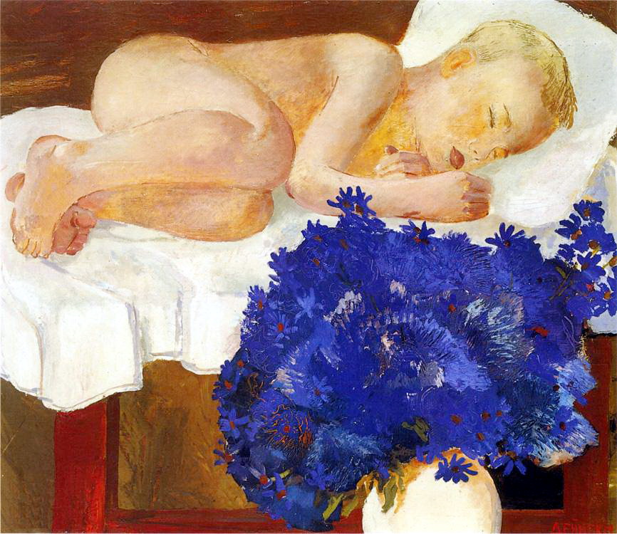 Русский : Спящий ребенок с васильками / Александр Александрович Дейнека. – 1932. – Холст, масло ; 67 × 78 см. – (Частная коллекция).