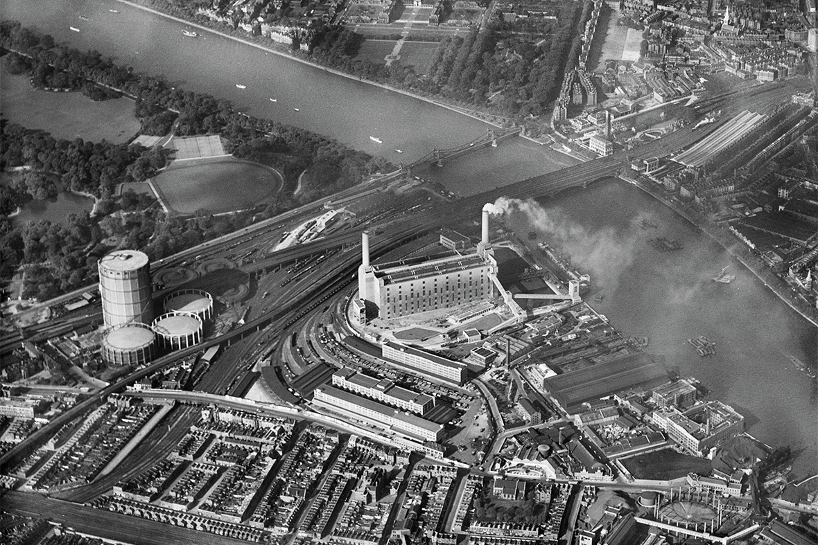 Description: Battersea Power Station alongside the River Thames, Battersea, 1933, when it had just two chimneys. London, England, United Kingdom.