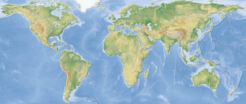 Planisphère avec relief, cours d'eau et glaciers, sans les zones polaires inhabitées.