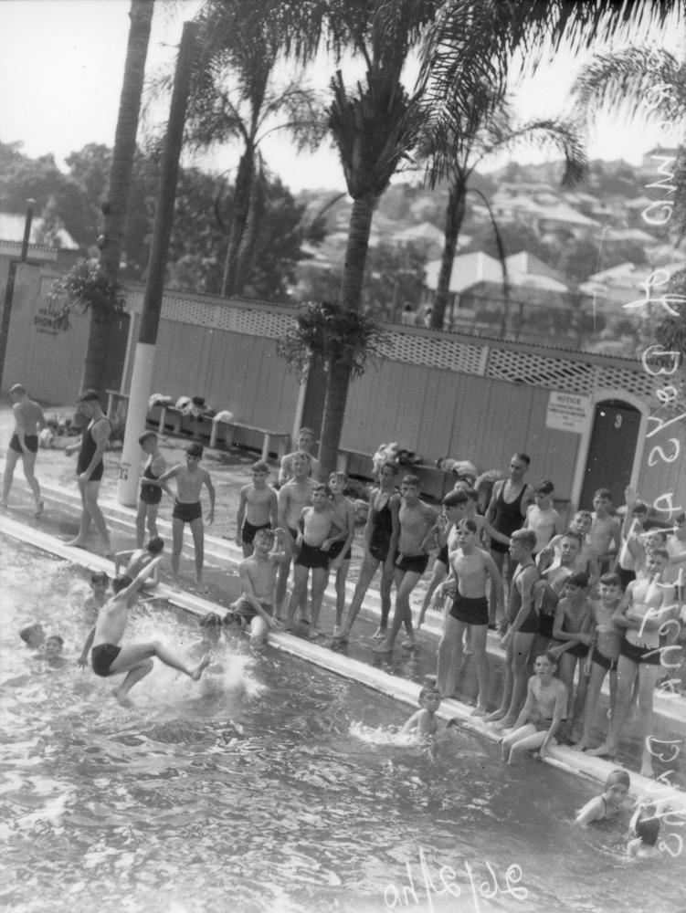 Description: Crowd of boys at Ithaca Baths (26 February 1940). Brisbane, Queensland, Australia. John Oxley Library, State Library of Queensland.