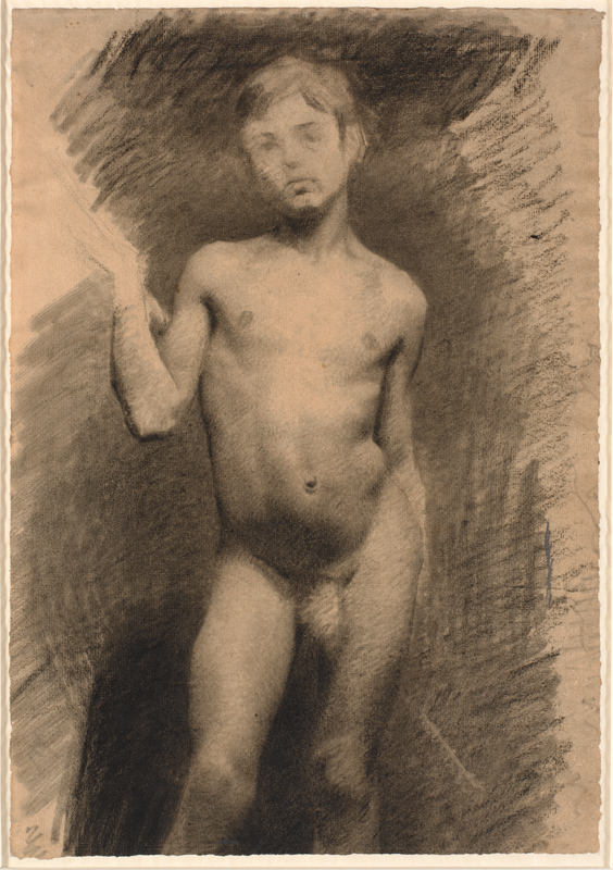 English : Standing nude boy : model study / Vilhelm Hammershøi. – 1884-1885. – Charcoal and pencil on ribbed, yellowed paper ; 44 × 31 cm. – (Copenhagen, Denmark : National Gallery of Denmark ; KKS1975-491).