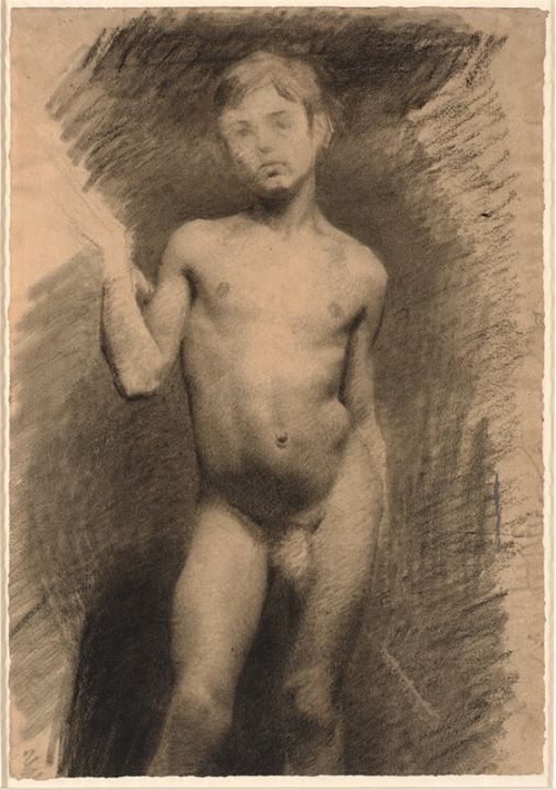 Dansk : Stående nøgen dreng : modelstudie / Vilhelm Hammershøi. – 1884-1885. – Kul og blyant på ribbet, gulnet papir ; 44 × 31 cm. – (København, Danmark : Statens Museum for Kunst ; KKS1975-491).