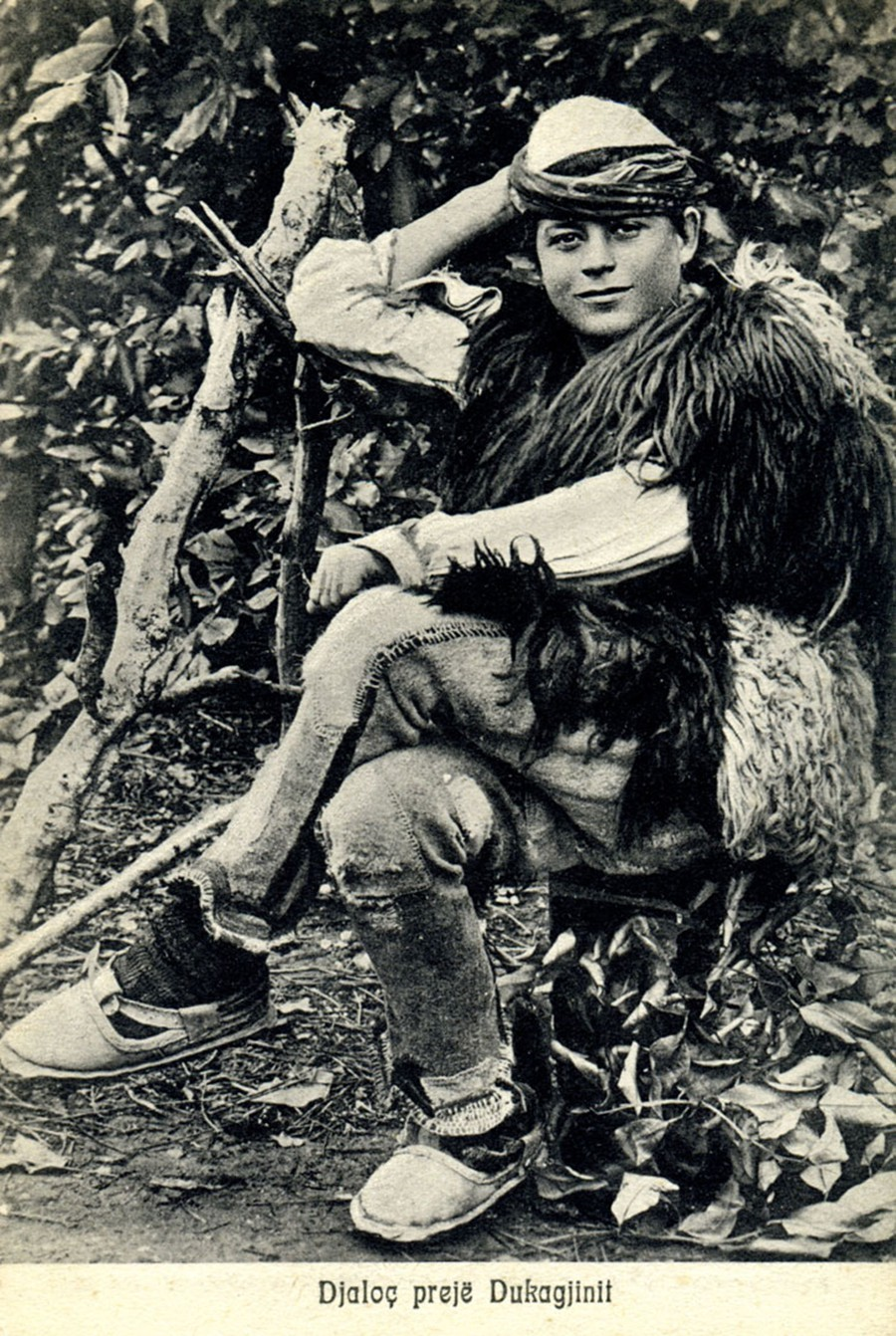 Description: Postcard showing an Albanian boy in folk costume. Dukagjin highlands, 1929. Photograph by Mark (Shan) Pici.