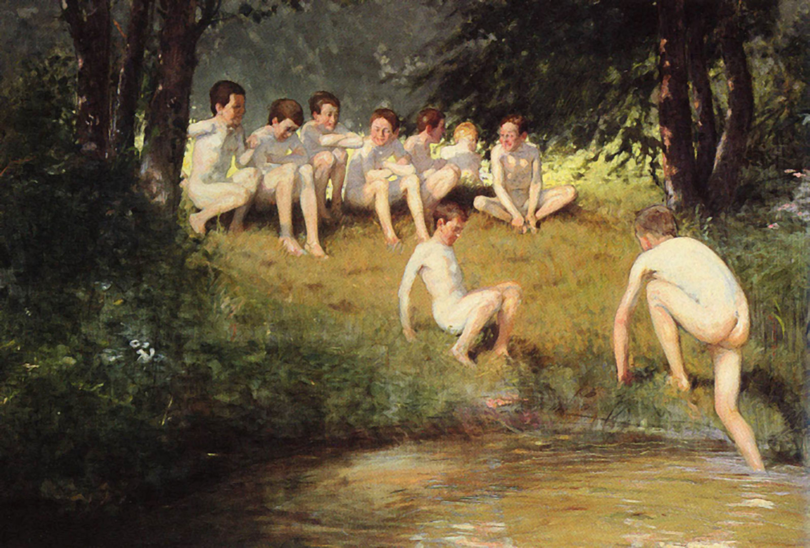 English : At the swimming hole / Josef Eduard Sauer. – 20th century. – Oil on canvas ; 97 × 142 cm. – (Private coll.).