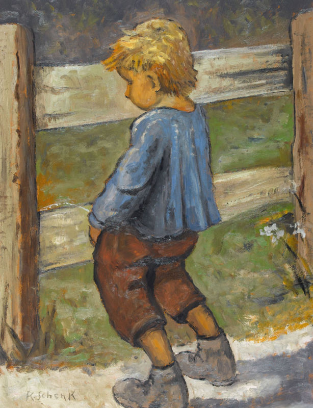 English : Boy at the fence / Karl Schenk. – 20th century. – Oil on fiberboard ; 59 × 45 cm. – (Private coll.).