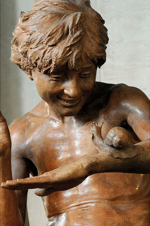 Français : L’enfant à l’escargot / attribué à Adolphe-Martial Thabard. – Détail. – Plâtre patiné ; H 110 × L 40 × P 75 cm.
