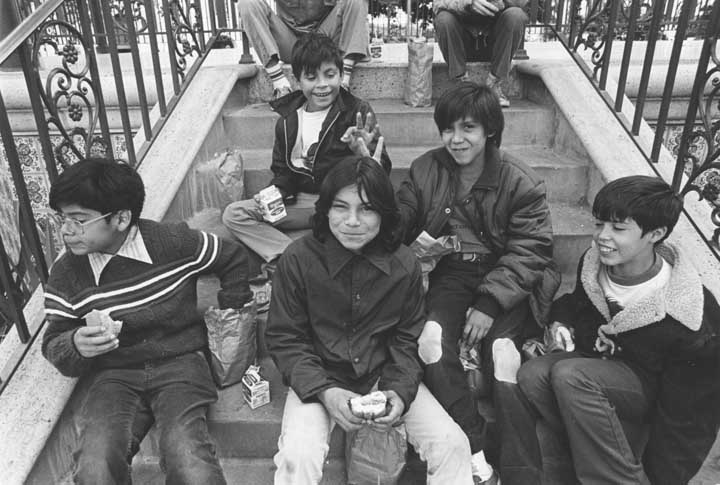 Description: Five Mexican boys on steps (1975). Photograph by William Reagh. Group portrait of five boys sitting on steps at the Plaza eating brown bag lunches. Two of the boys are clowning for the camera. Los Angeles, Los Angeles County, California, United States. California History Section Picture Catalog, California State Library, Sacramento.
