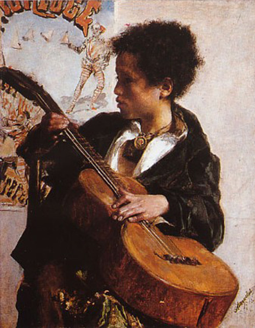 '''Français''' : | '''Français''' : ''Gamin à la guitare'' / Antonio Mancini. – 1877-1878. – Huile sur toile ; 82 × 65 cm. – (Collection privée). | ||