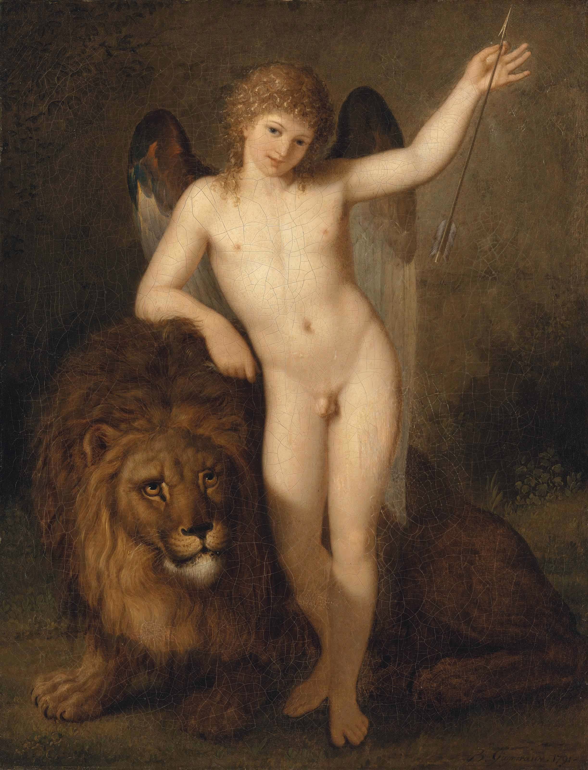 Français : Cupidon et le lion / Bénigne Gagneraux. – 1791. – Huile sur toile ; 50 × 39 cm. – (Coll. particulière).