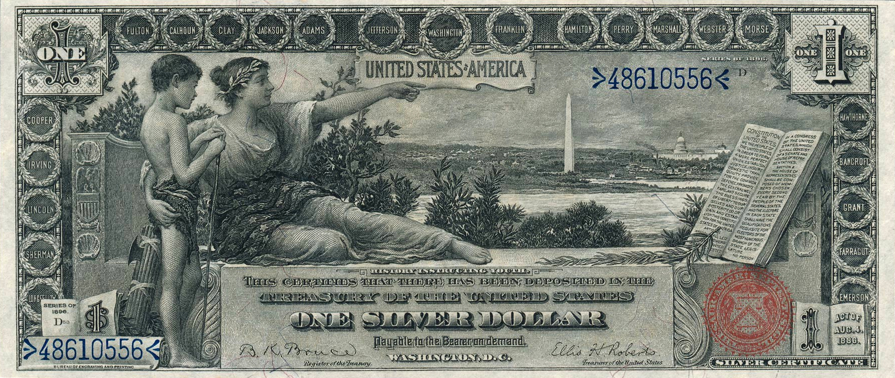 current20:28, 25 November 2013Thumbnail for version as of 20:28, 25 November 20131,788 × 756 (840 KB)Aetos (talk | contribs)---- '''Deutsch''' : ---- '''English''' : ''One dollar silver certificate'' / after Will Hicok Low ; engraved by Charles Schlecht. – 1896. – Intaglio ; 189 × 79 mm. :<small>The design is known as “History instructing Youth”, and the banknote a