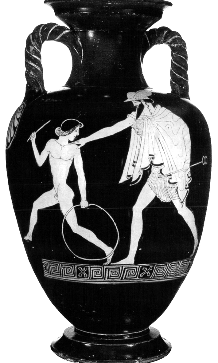 Description: Hermes and Ganymede. Attic red-figure neck-amphora by the Alkimachos Painter, c. 470 BC. St. Petersburg, State Hermitage Museum, ГР-7028.