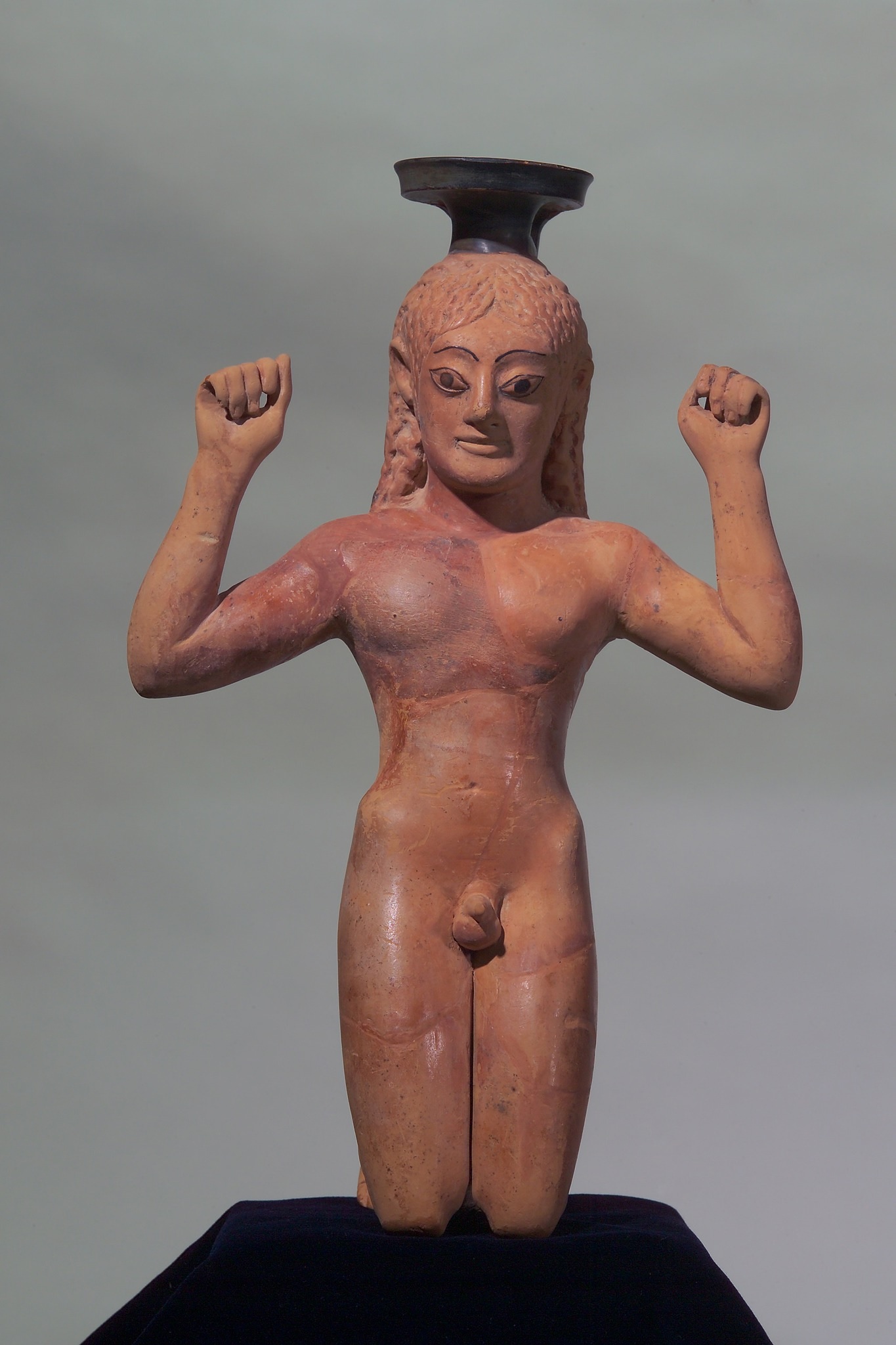 Description: Kneeling Boy. Archaic Greek ceramic aryballos, a vessel for perfume or oil, in the shape of a kneeling diadumenos, a victorious athlete binding a fillet around his head, ca. 540–530 B.C. Athens, Ancient Agora Museum, P 1231.