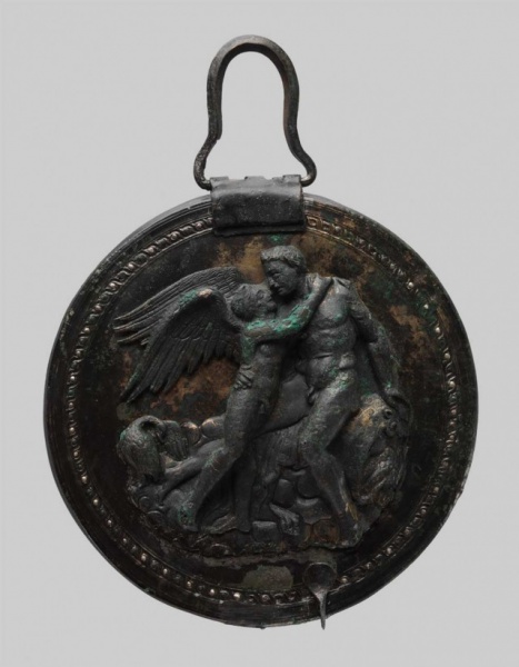 Description: Mirror of Eros. Bronze mirror with outer lid showing Eros embracing Dionysus, 4th century BC. Recovered from a tomb in the necropolis of Aigai at Vergina, Central Macedonia, Greece.